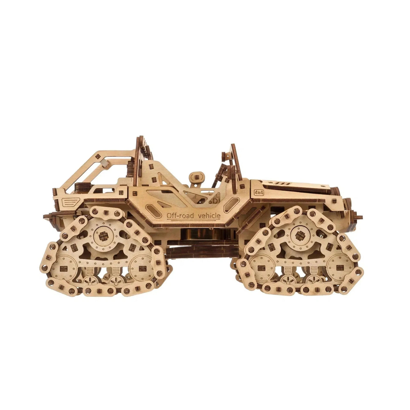 Ain't no mountain high enough, ain't no valley low enough, ain't no river wide enough, to keep this jeep from gettin' through! The Tracked Off-Road Vehicle from Ugears is an eye-poppin' rock hoppin', heart-stoppin' ride. Whatever your 4x4 of choice, whether you use a UTV for hunting or to get around the farm, a sport ATV for thrilling trail adventure, a side-by-side for family trips in the country, a dune buggy for getting to your favorite surf spot, or a truck for work and adventure, just one look at the tracks on this wooden jeep model will trigger your "I want!" reflex.